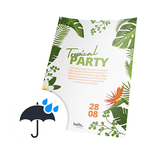 Posters nodig die tegen weer en wind kunnen? Zorg ervoor dat jouw posters in elke weersomstandigheid leesbaar blijft en bestel onze Waterbestendige Posters. Deze posters zijn gemaakt van polyester papier waardoor het waterbestendig is. Zo blijven jouw posters lang mooi en kan je gerust je poster overal ophangen. Door de waterbestendige laag gaan deze posters langer mee dan standaard posters.